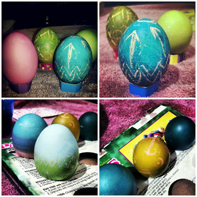 First, we colored eggs! I hadn't done this since childhood and I'm sure Scott hasn't either, although it only took five minutes into our decorating session to realize that Scott is a talented conceptual egg artist. As always, the overachiever...he was making magic, I'm telling you. I on the other hand, stuck to the basics. I wanted bright colors (florescent if possible) and only experimented on a couple of my eggs.
